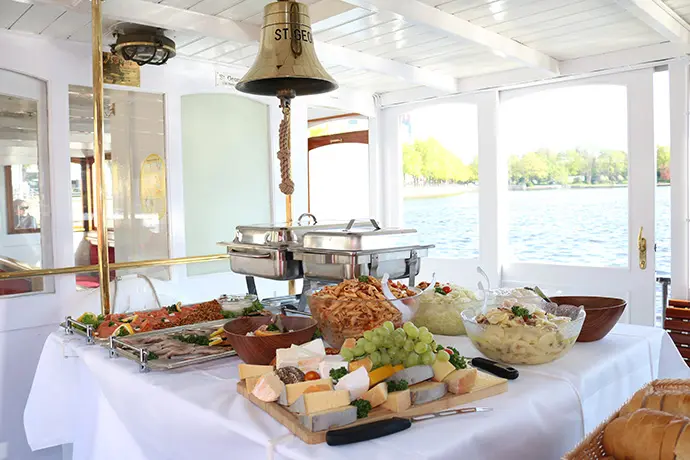 Wir bieten für Ihre Veranstaltung an Bord des historischen Dampfschiffes „St .Georg“ Bewirtungsmöglichkeiten, die speziell auf die räumlichen Möglichkeiten dieses schwimmenden Kleinods abgestimmt sind. Alle Buffets sind ab 25 Personen.